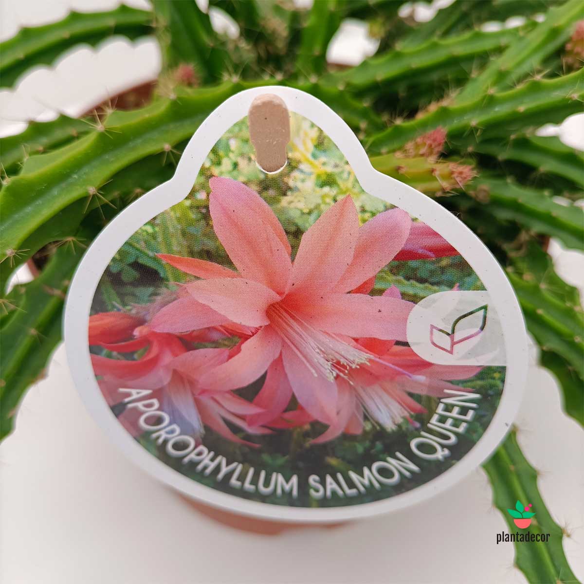 El Aporophyllum ‘Salmon Queen’ es un híbrido espectacular de cactus epífito, conocido por sus flores grandes en tonos salmón intenso que contrastan con sus tallos largos y colgantes de color verde vibrante. Es una planta exuberante y de crecimiento rápido, ideal para cestas colgantes o macetas elevadas, donde sus tallos pueden desbordarse elegantemente.
