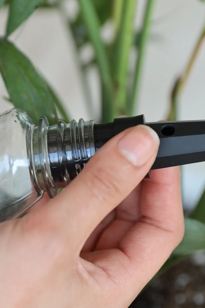 Llena una botella con agua y enrosca el sistema de riego.
