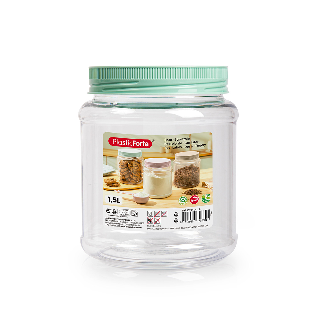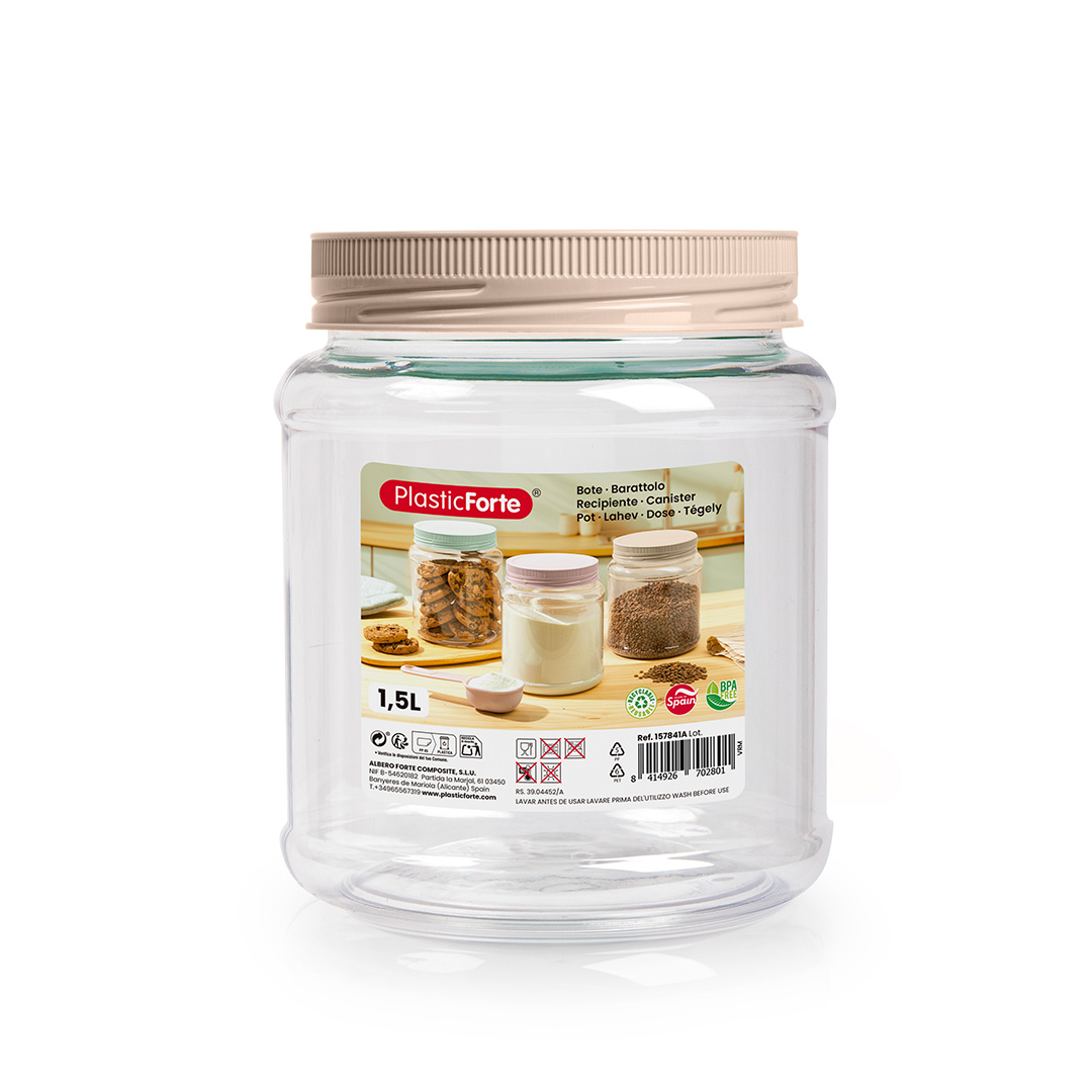 El Bote Boston 1,5 L PET de Plastic Forte está diseñado para el almacenamiento de alimentos de forma práctica y segura, ofreciendo un formato funcional y una estética limpia que encaja en cualquier cocina.