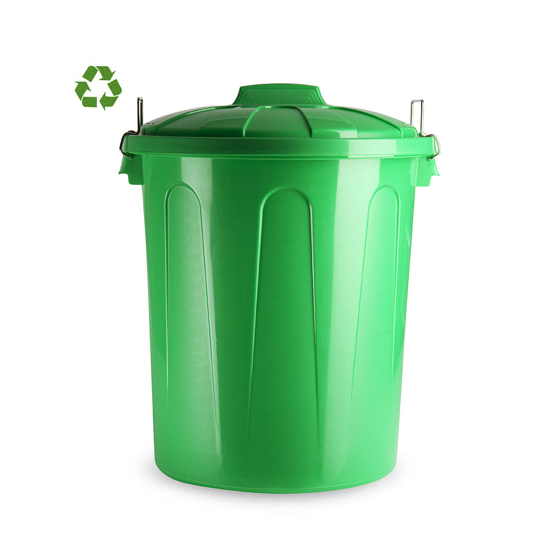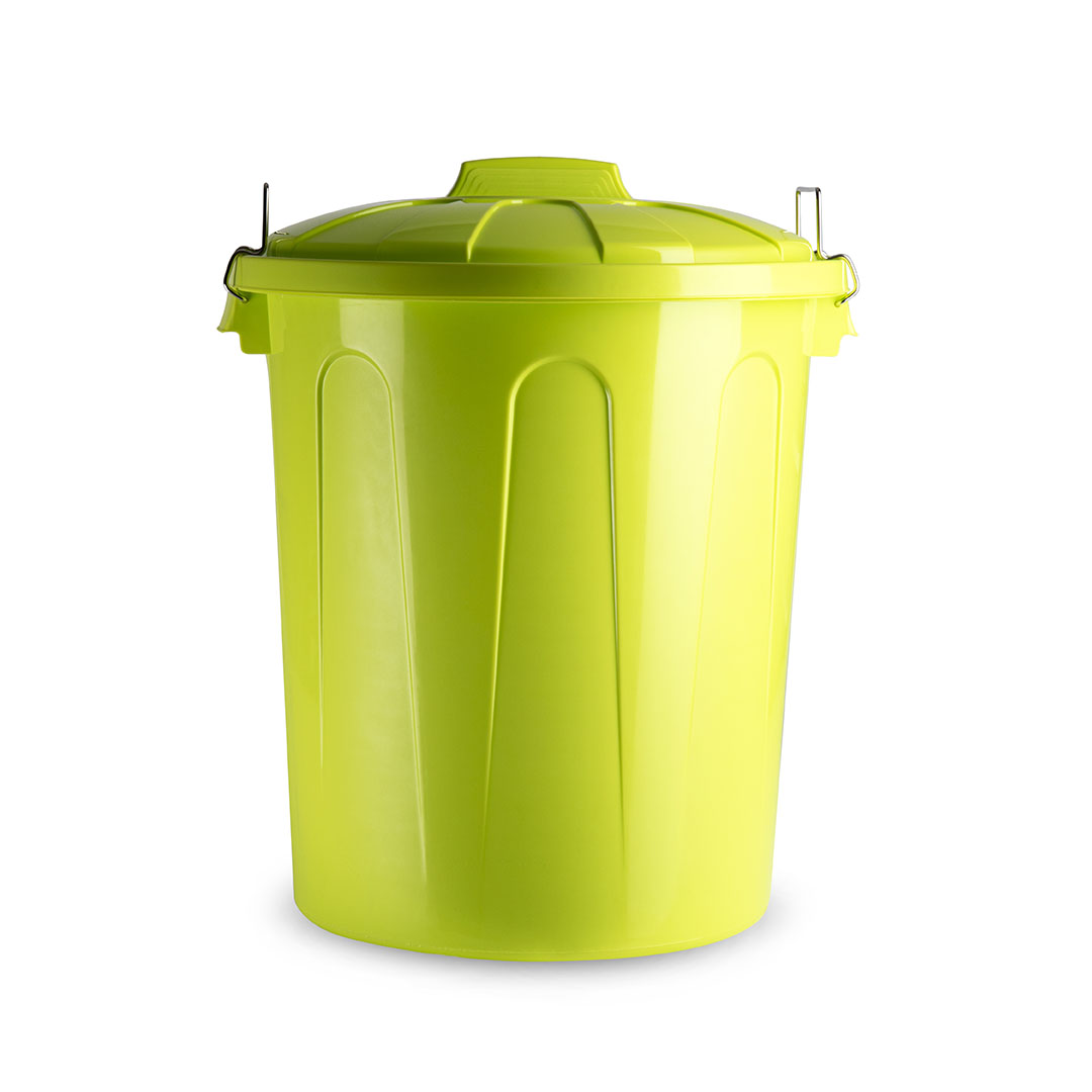 Cubo de basura con capacidad para 51 litros. Cuenta con dos asas metálicas que sirven como cierres a presión para su tapa extraíble.