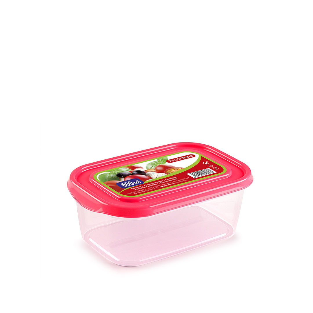 Las fiambreras Basic rectangulares son BPA free y pueden utilizarse en lavavajillas, microondas y congelador. Esta fiambrera tiene una capacidad de 600 ml. Tiene base transparente y tapa en colores surtidos. Fabricada en España.