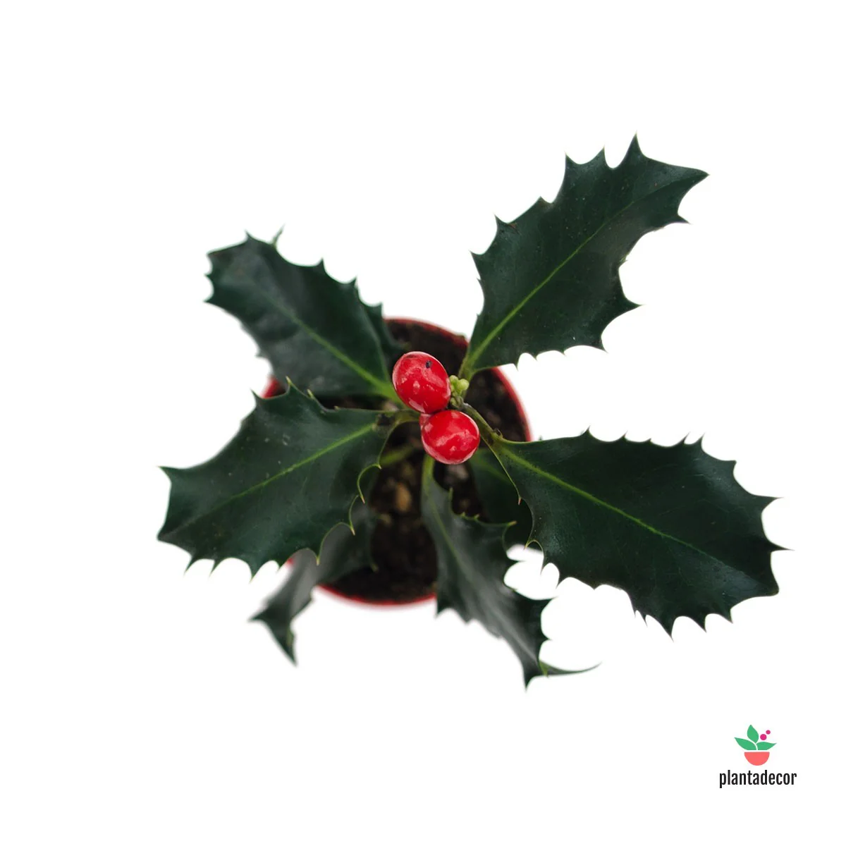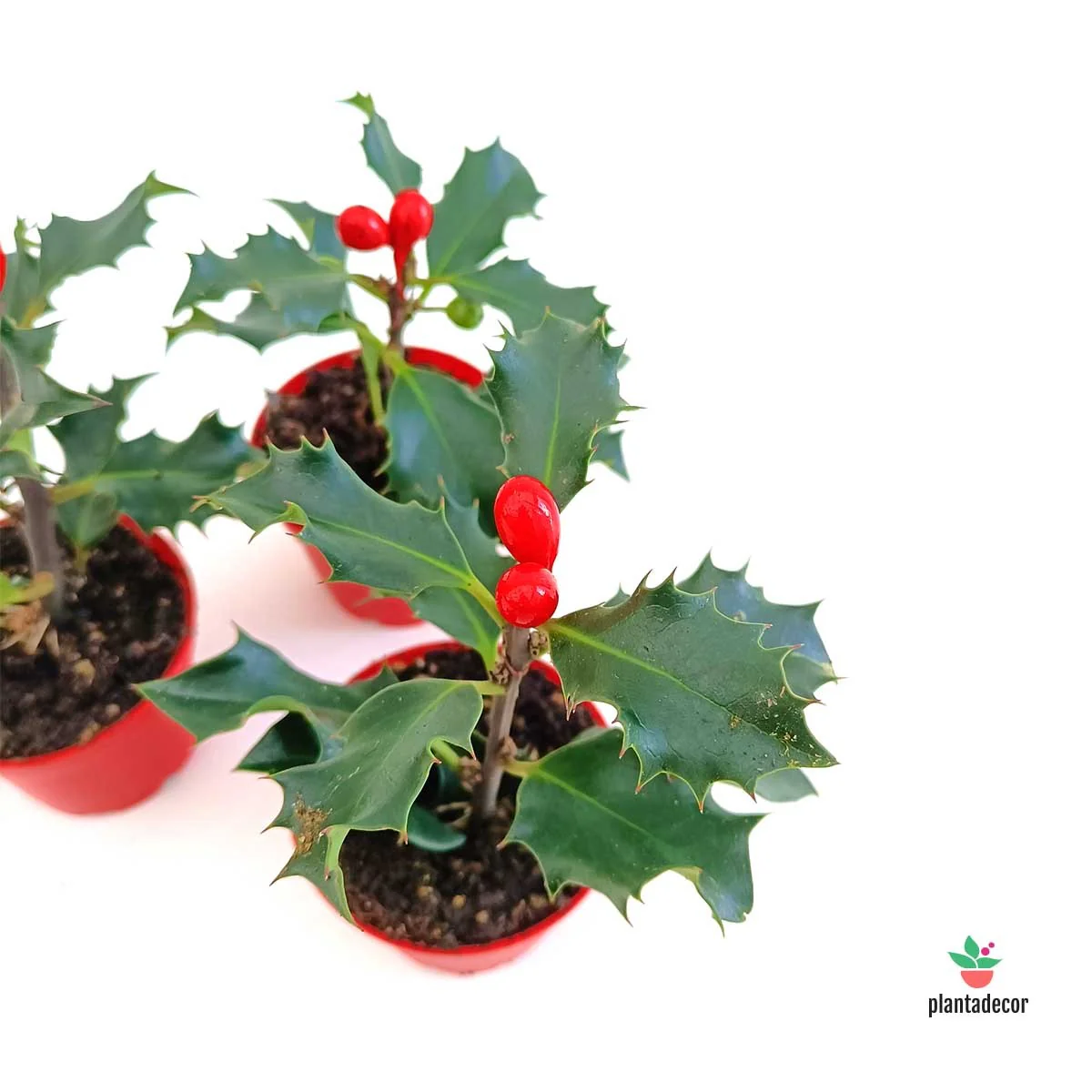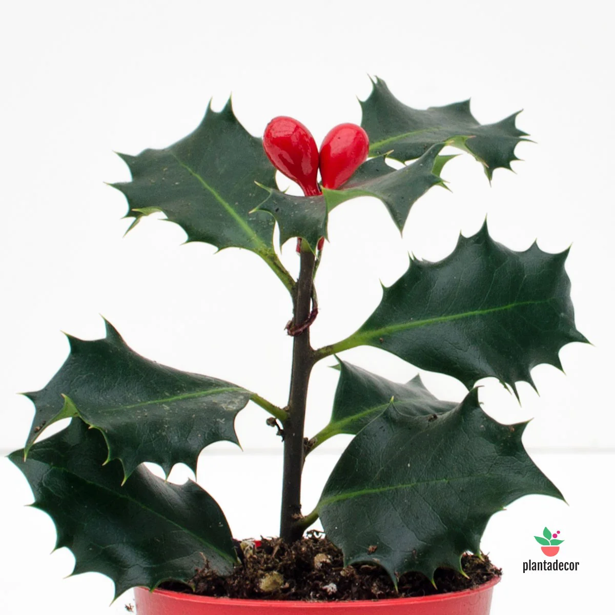 La Ilex aquifolium, conocido comúnmente como acebo común, es un arbusto o pequeño árbol perenne de follaje intenso y brillante, famoso por sus hojas verdes coriáceas con bordes espinosos y sus bayas rojas brillantes que aparecen en otoño e invierno. Su porte elegante y estructurado lo convierte en una planta ideal para jardines, terrazas y setos.