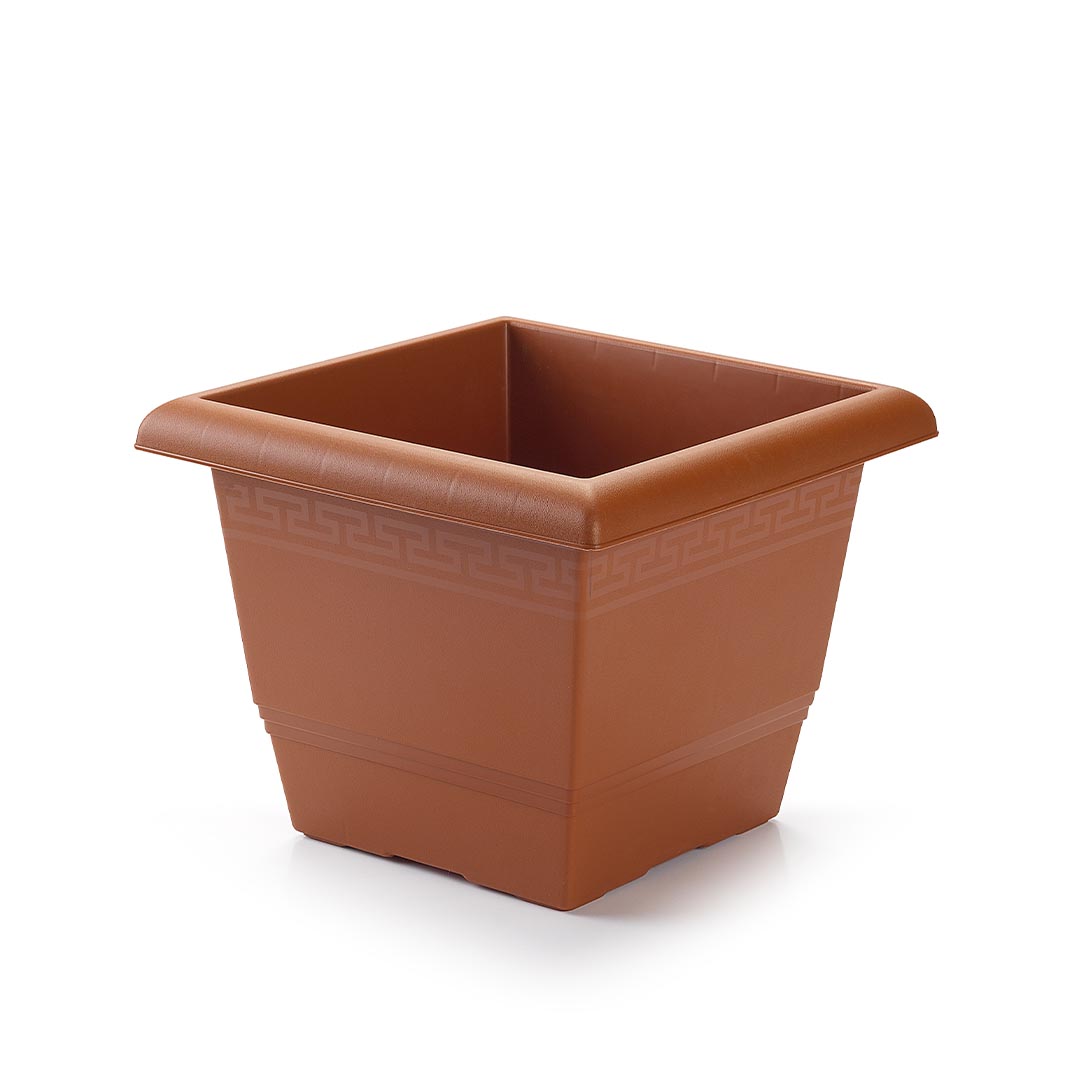 Maceta cuadrada de plástico de 20 cm. Acabado mate con una cenefa decorativa en la parte superior.