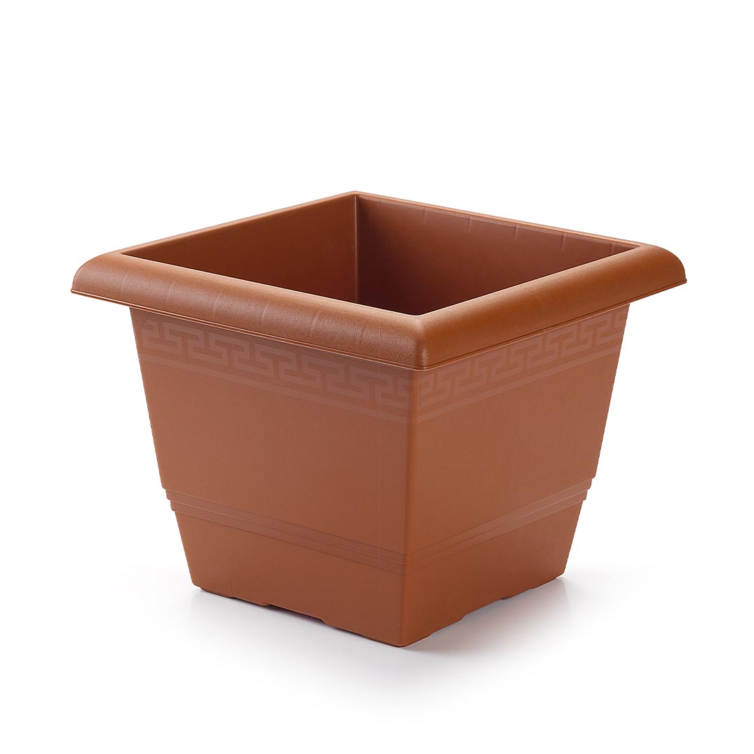 Maceta cuadrada de plástico de 25 cm. Acabado mate con una cenefa decorativa en la parte superior.