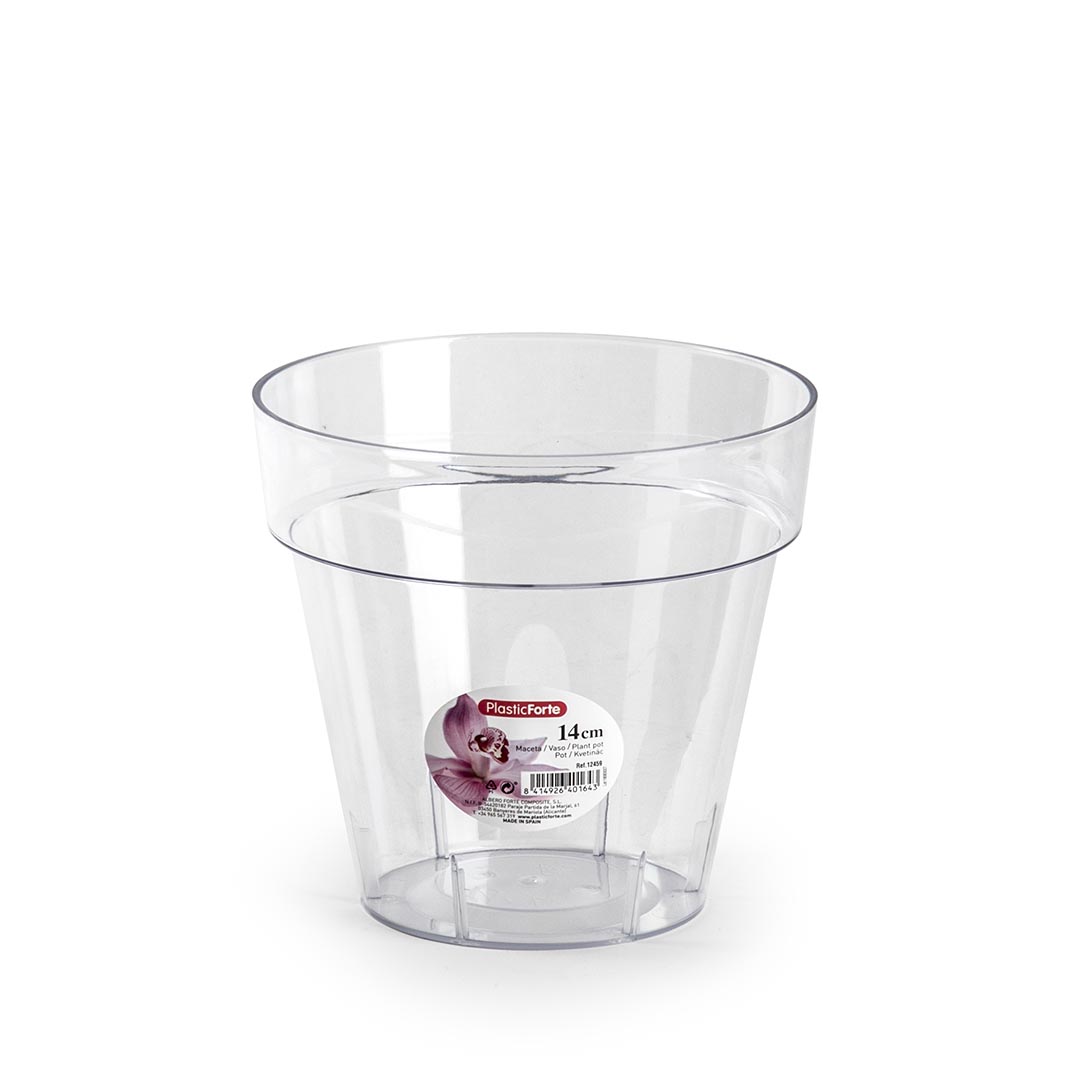 Esta maceta transparente está fabricada con plástico efecto cristal. Tiene 14 cm de diámetro y funciona como elemento decorativo además de funcional. Disponible en otros tamaños. Fabricada en España.
