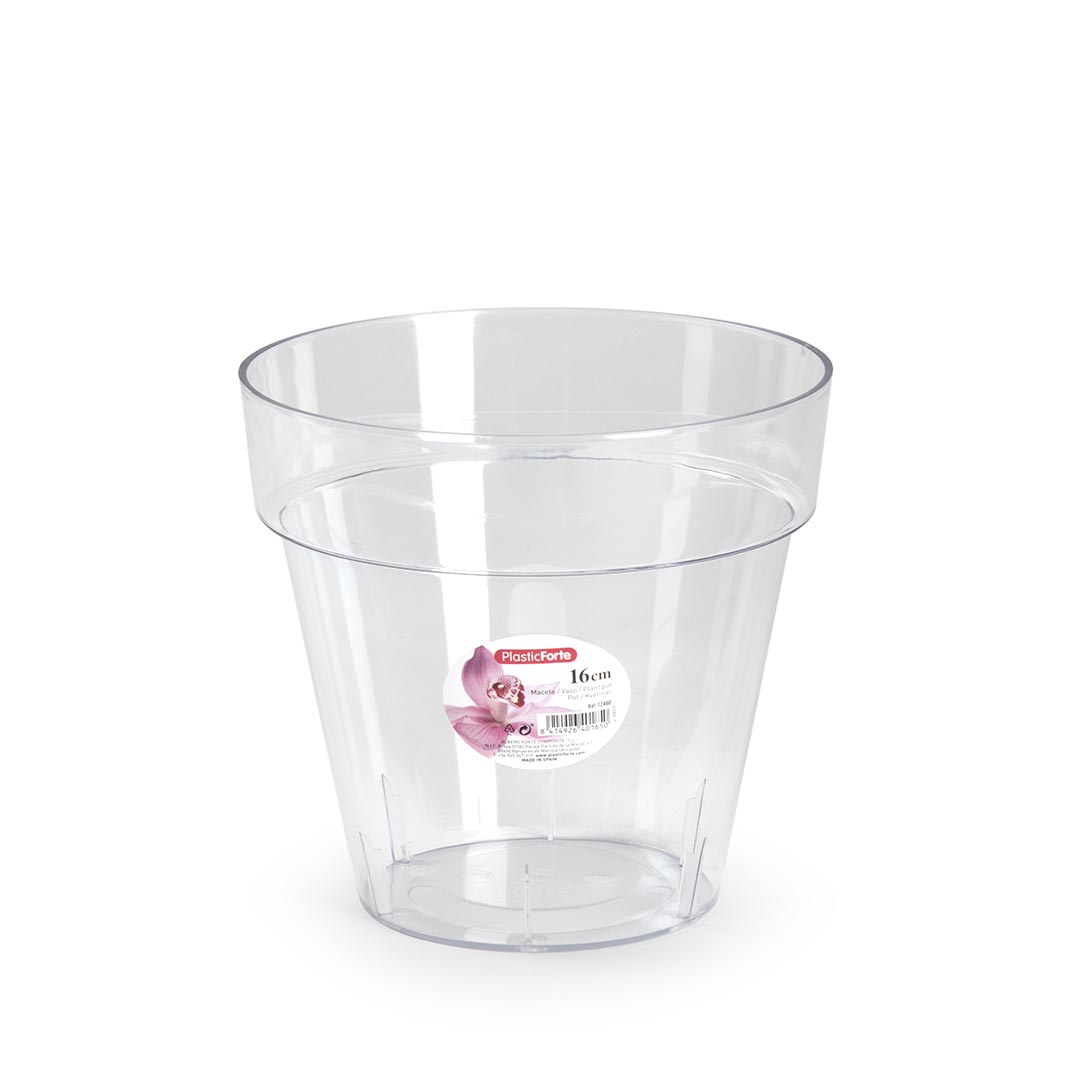 Esta maceta transparente está fabricada con plástico efecto cristal. Tiene 16 cm de diámetro y funciona como elemento decorativo además de funcional. Disponible en otros tamaños. Fabricada en España.