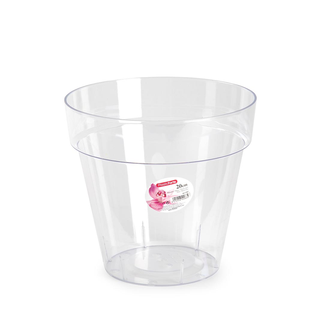 Esta maceta transparente está fabricada con plástico efecto cristal. Tiene 20 cm de diámetro y funciona como elemento decorativo además de funcional. Disponible en otros tamaños. Fabricada en España.