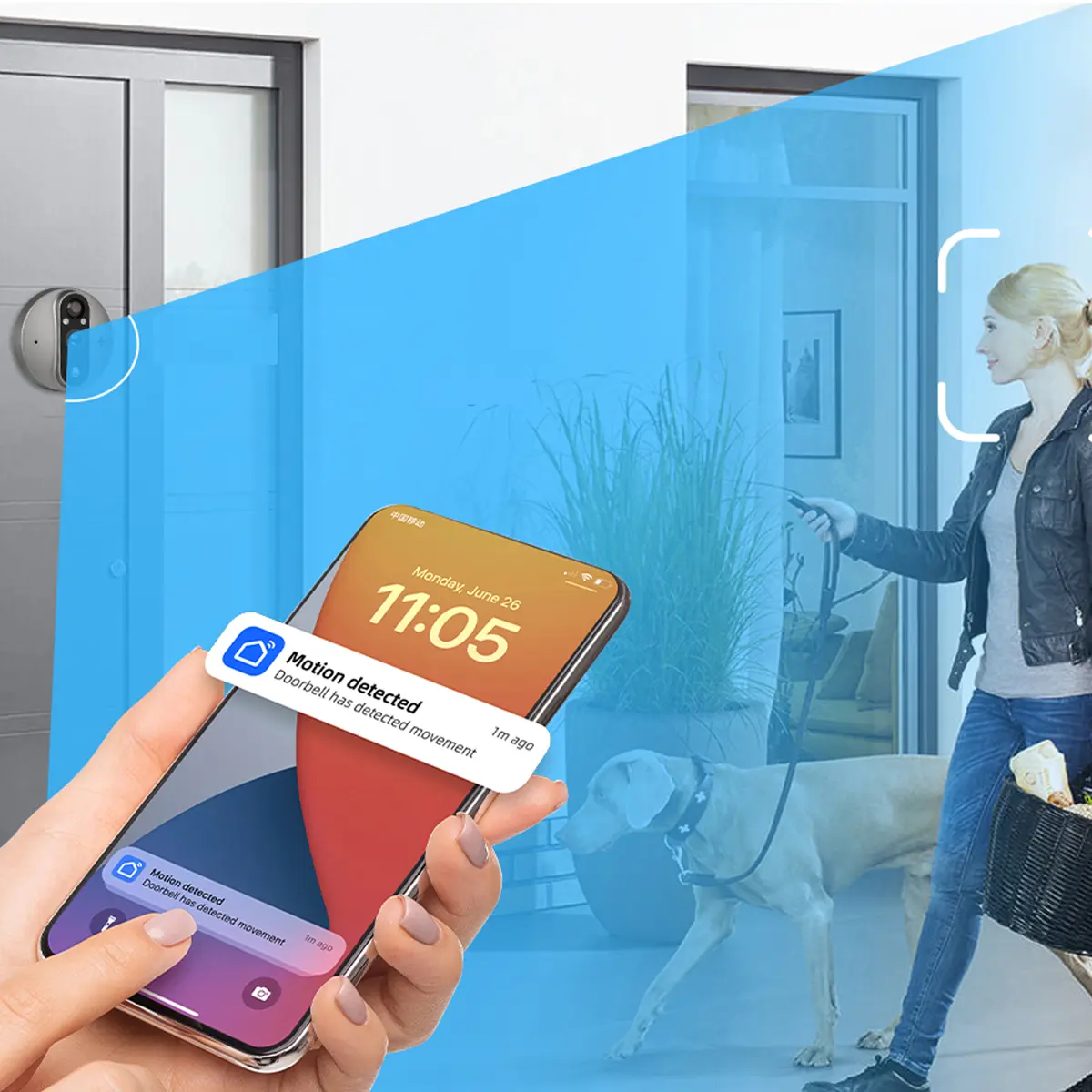 Ya que posee una conexión WiFi, podrás gestionar la mirilla de forma remota a través de la APP Tuya Smart desde tu propio móvil. Además, con el detector de movimiento PIR recibirás notificaciones instantáneas cuando alguien se acerca a tu puerta, mejorando la seguridad en tu hogar.