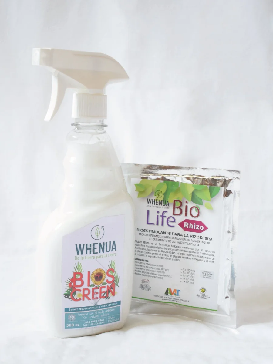 BLOS CREEN: Es una barrera dispersarte de la radiación solar a base de minerales naturales, que evita el daño de quemaduras y estrés solar en las plantas.