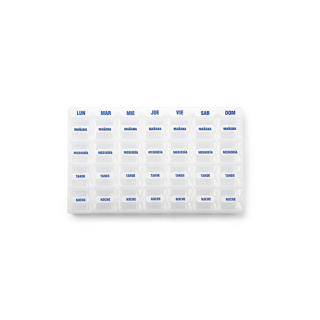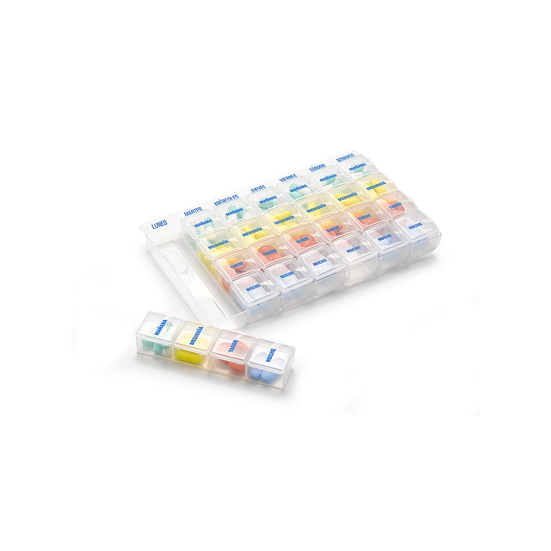 Este pastillero semanal cuenta con separadores diarios de 4 tomas cada uno. Los separadores son extraíbles, perfectos para llevar.