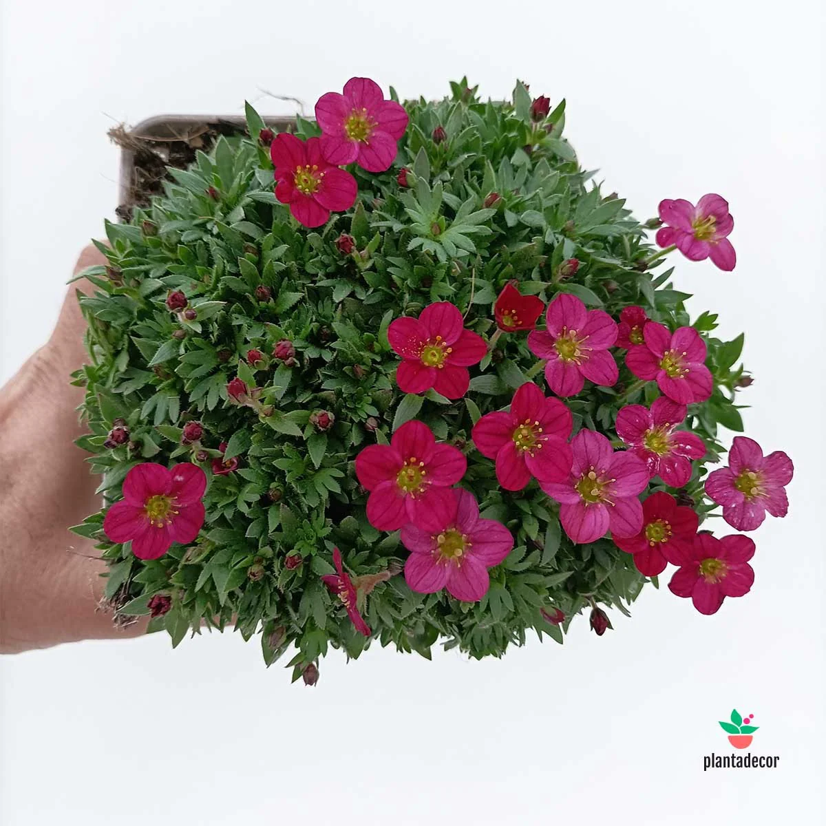 La Saxifraga x arendsii ‘Red’ es una planta perenne compacta y resistente, perfecta para rocallas, borduras y macetas. Sus delicadas flores de un rojo intenso con toques rosados crean un hermoso contraste con su follaje verde denso, formando una alfombra de color que florece en primavera y principios de verano.