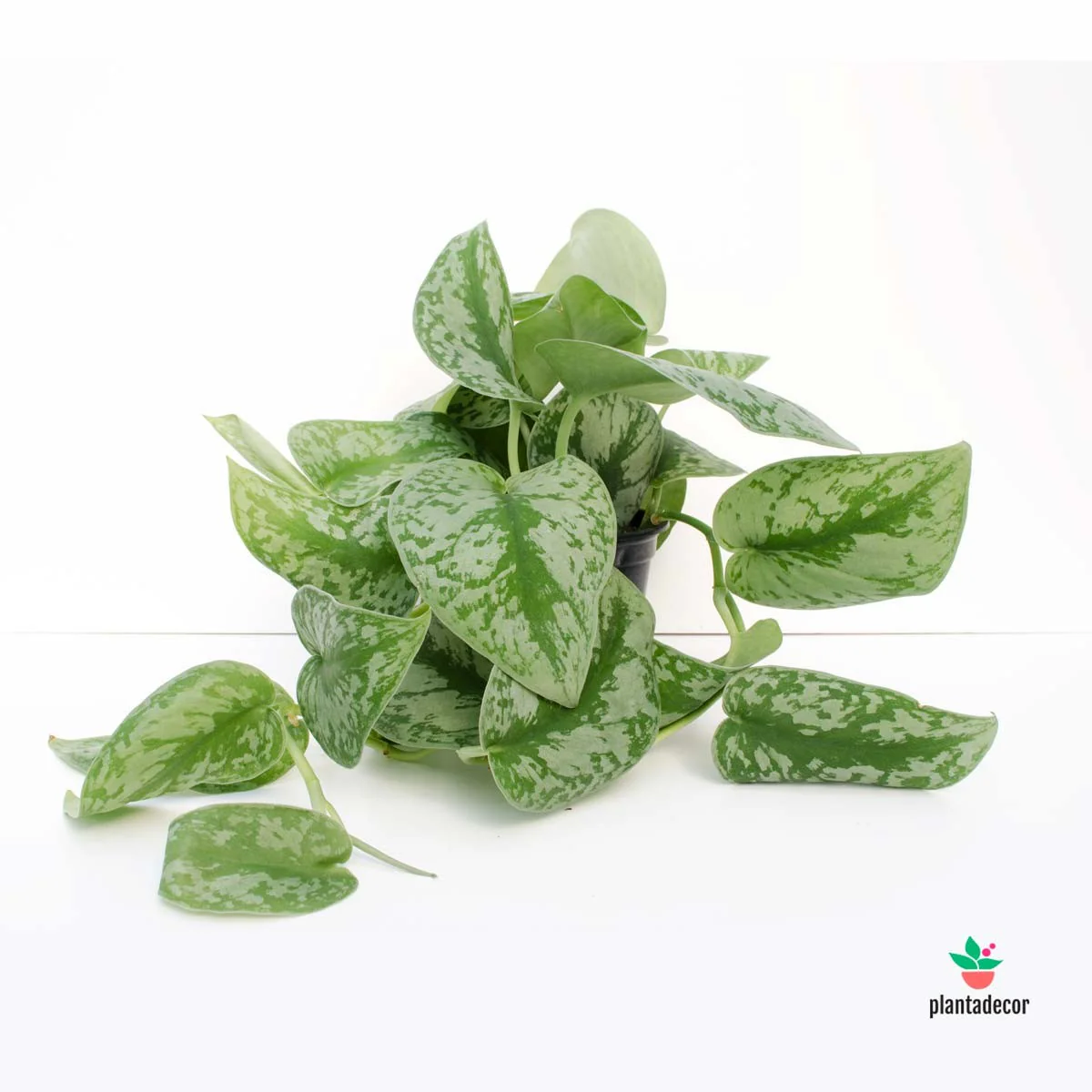 El Scindapsus pictus ‘Trebie’ es una planta trepadora o colgante muy apreciada por su follaje verde oscuro salpicado de grandes manchas plateadas, que aportan un contraste luminoso y sofisticado. Sus hojas, de mayor tamaño que las de otras variedades como Argyraeus, convierten a esta planta en un ejemplar imponente y decorativo.