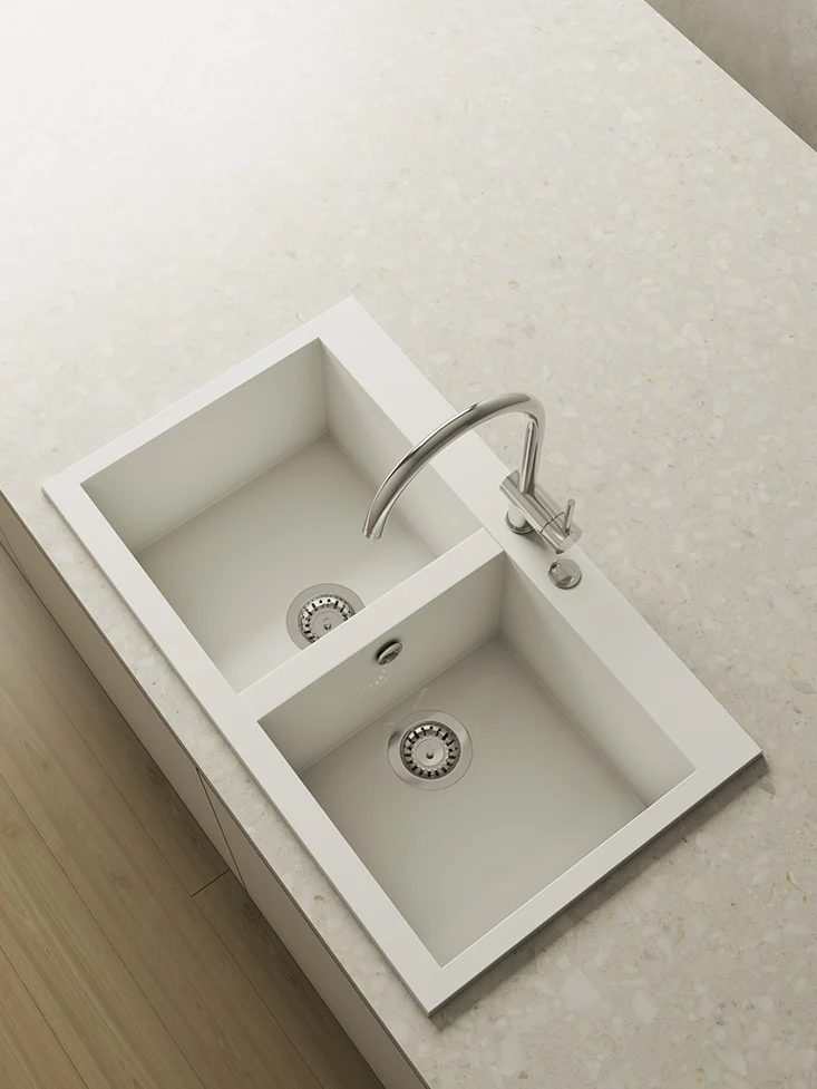 Perfecto para los espacios vivos y desenfadados, la versatilidad de este fregadero de resina Roc Stone® te permite optar por su colocación sobre o bajo encimera, así como elegir uno de nuestros colores estándar o personalizar el color de tu fregadero gracias al sistema Colorplus®.