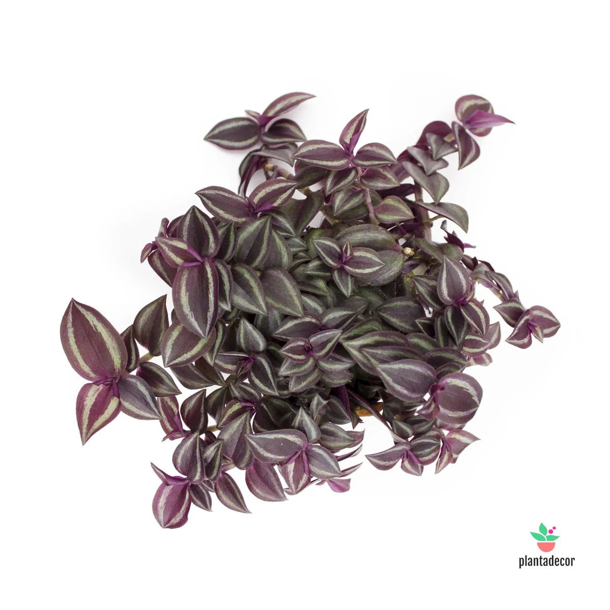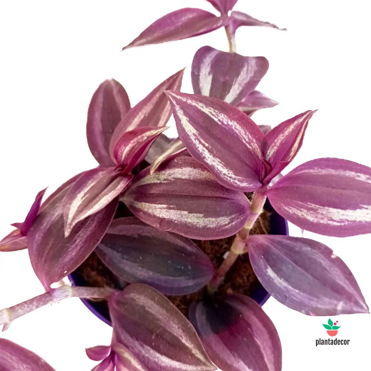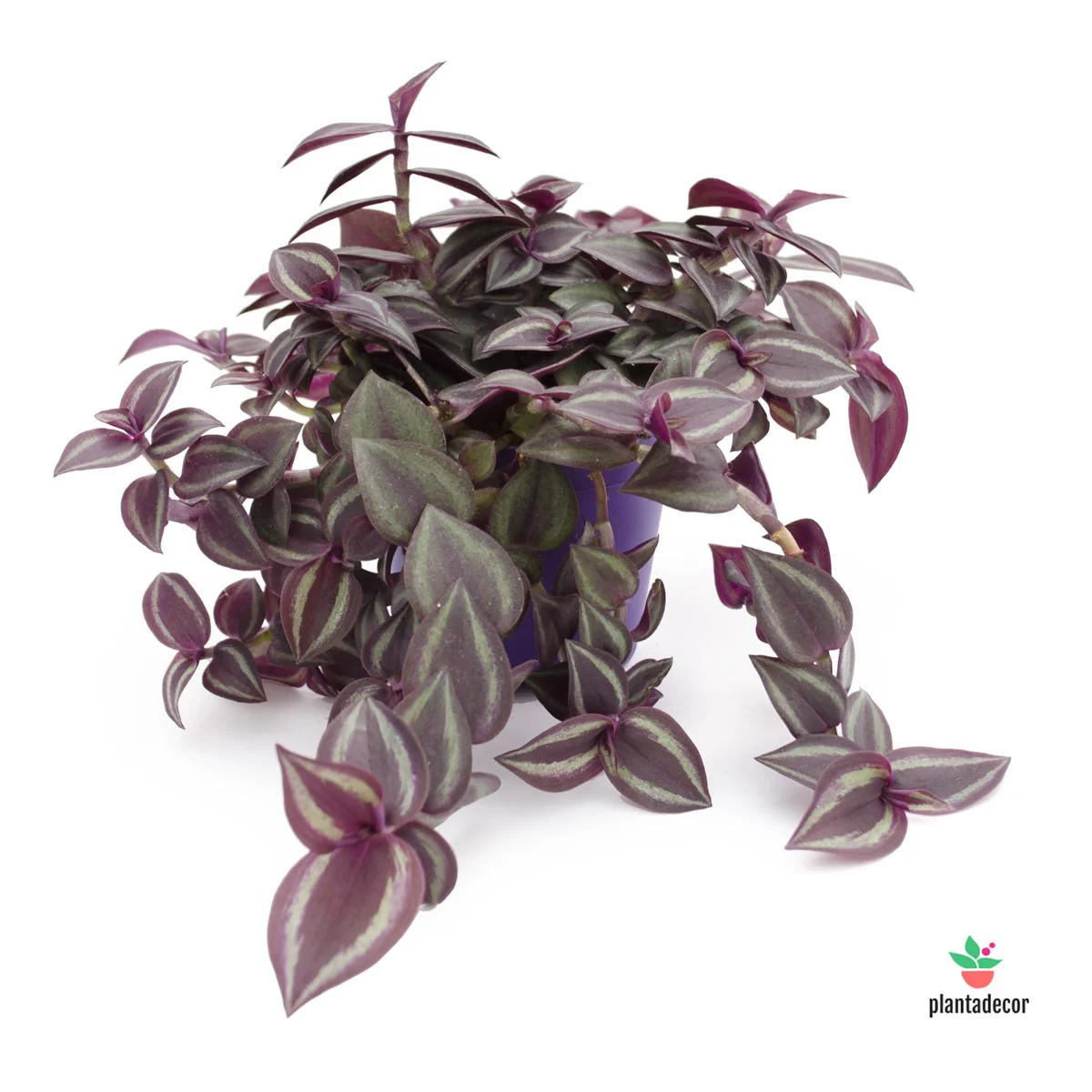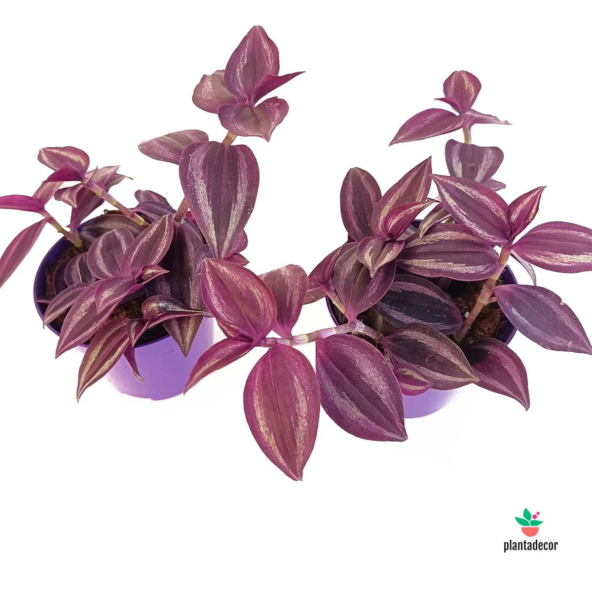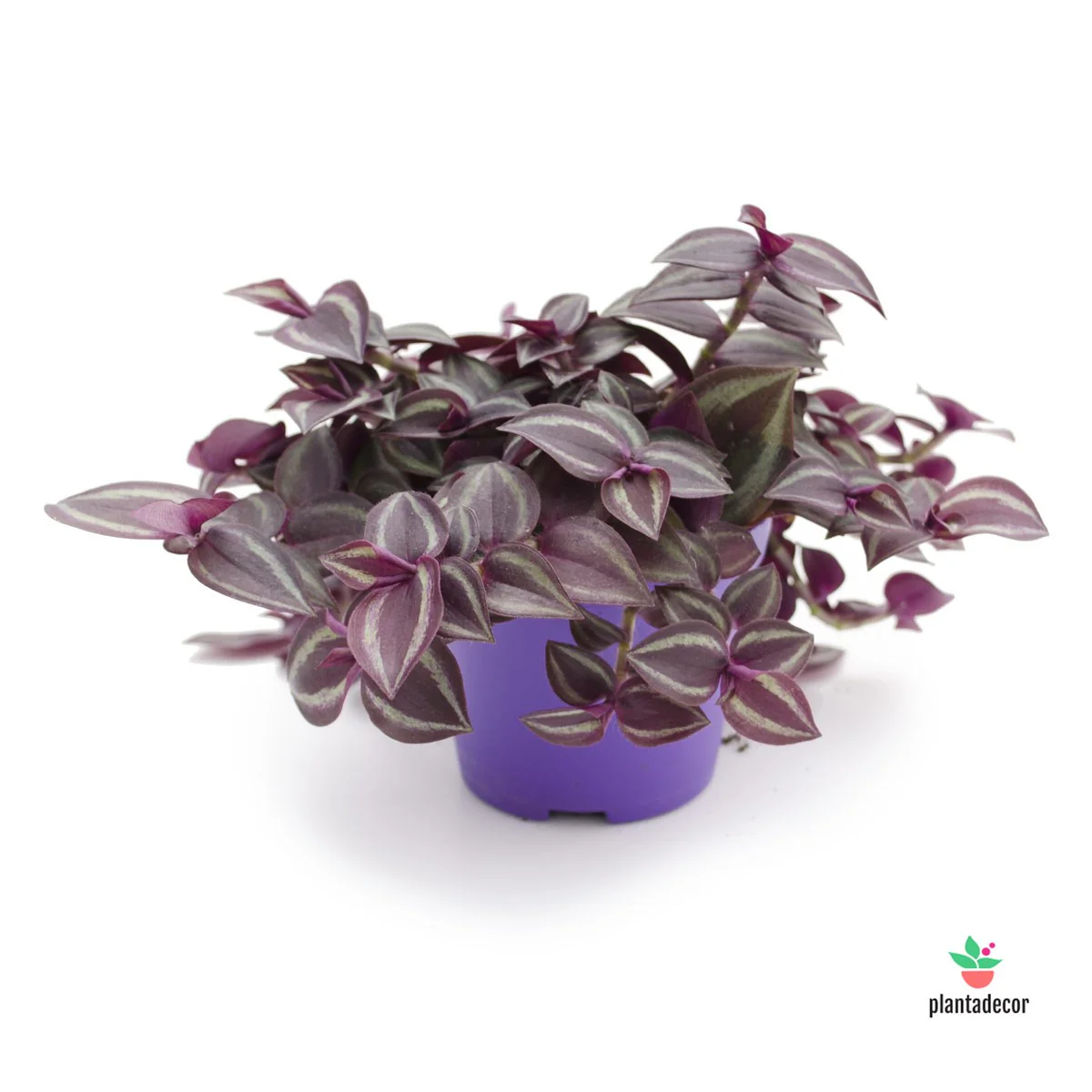 La Tradescantia zebrina ‘Purple Passion’ es una planta irresistible por su follaje bicolor y brillante, con hojas que combinan tonos púrpura intenso, verde metálico y plateado, formando un patrón en franjas que parece pintado a pincel. Su porte colgante y crecimiento veloz la convierten en una opción espectacular para macetas altas, estanterías o cestas colgantes.