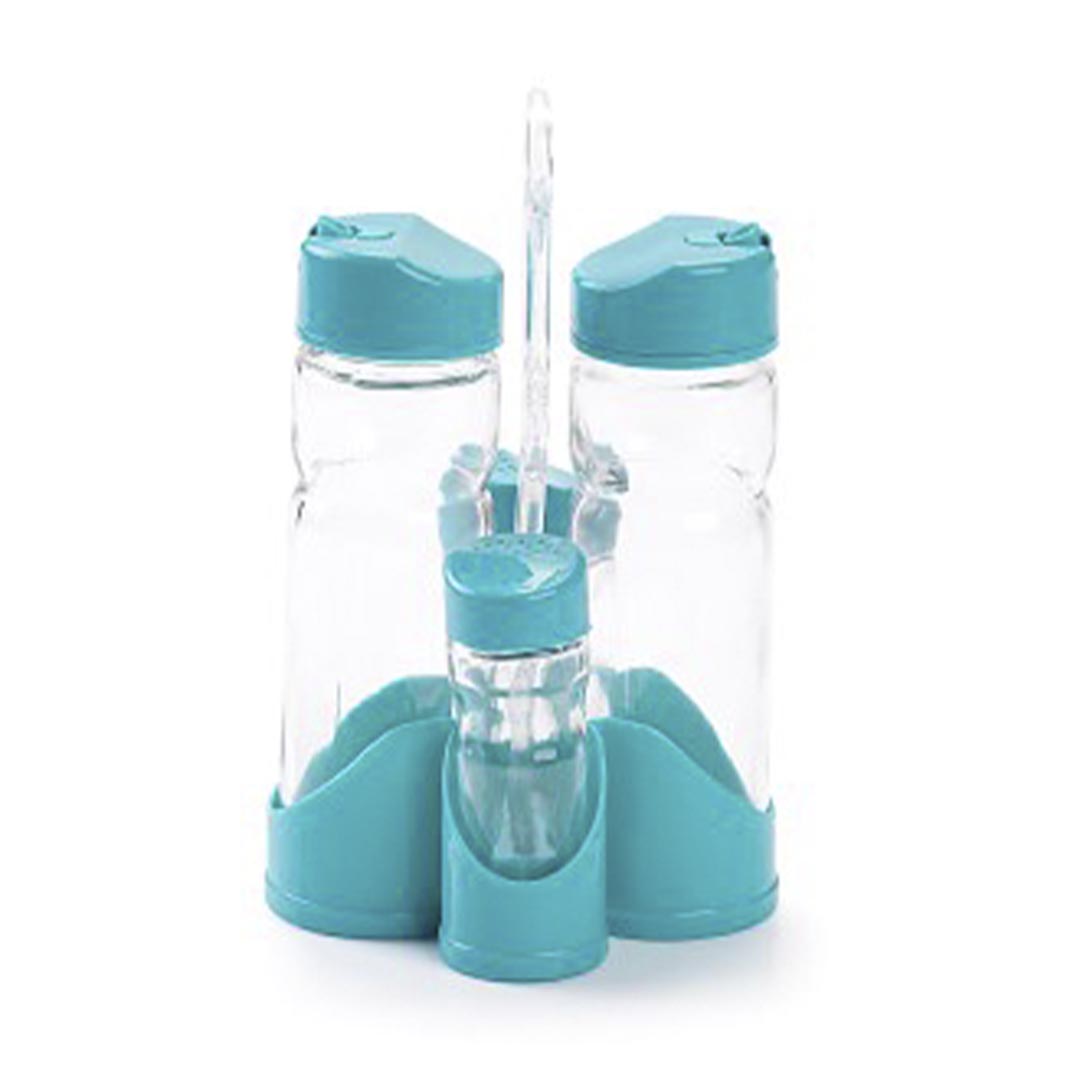 Esta vinagrera de mesa cuenta con dos recipientes para aceite vinagre o cualquier otra salsa y dos recipientes para sal o pimienta. El set cuenta con una base y un asa para poderlo transportar fácilmente.